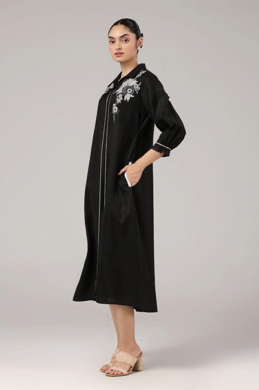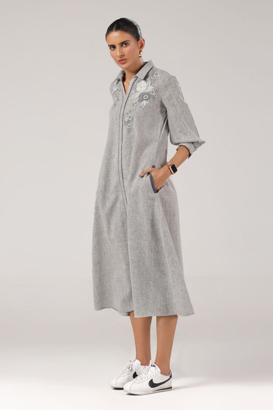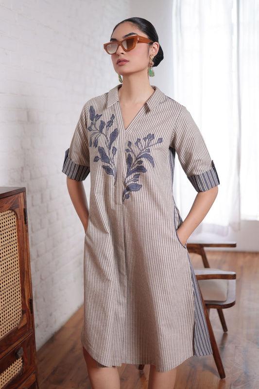 Cocoa Brown Embroidered Cotton Satin A-Line Dress