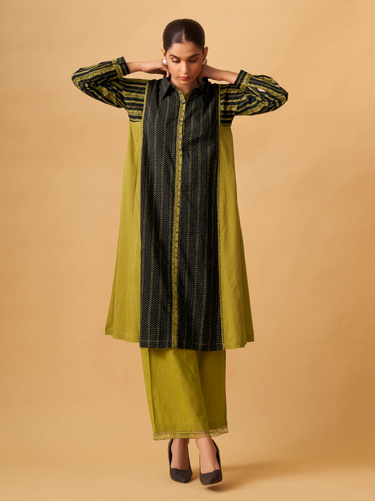 Elegant Mustard & Olive Printed Cambric Kurta Set with Modern Silhouette