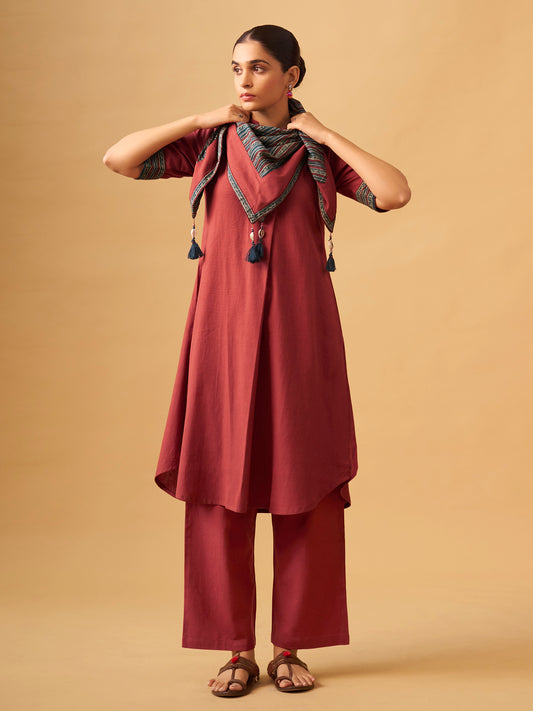 Cotton Kurta Set with Contrast Detailing & Tassel Scarf