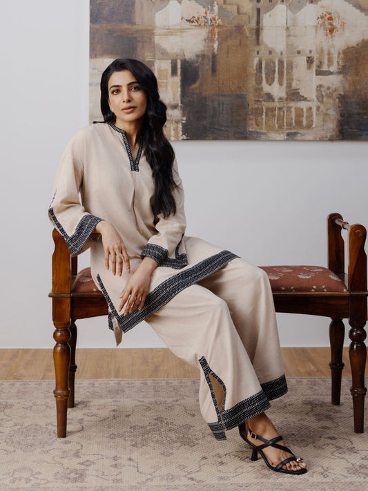 Women Beige Viscose Blend Kurta Set with Subtle Embroidery