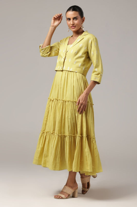 Mustard Cotton-Lurex Blazer & Tiered Dress Set
