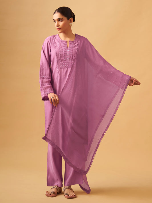 Pastel Lilac Embroidered Chanderi Suit Set With Dupatta