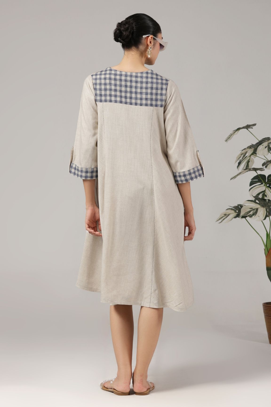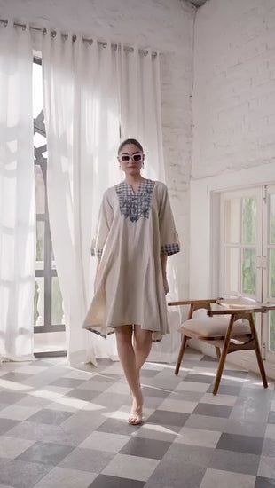 Beige and Navy High-Low Dress brings together relaxed charm and effortless elegance. Crafted in soft, breathable cotton, it features a contrast navy check yoke and sleeve cuffs for a chic touch. The flared high-low hemline and easy silhouette make it perfect for brunches, vacations, or laid-back summer days