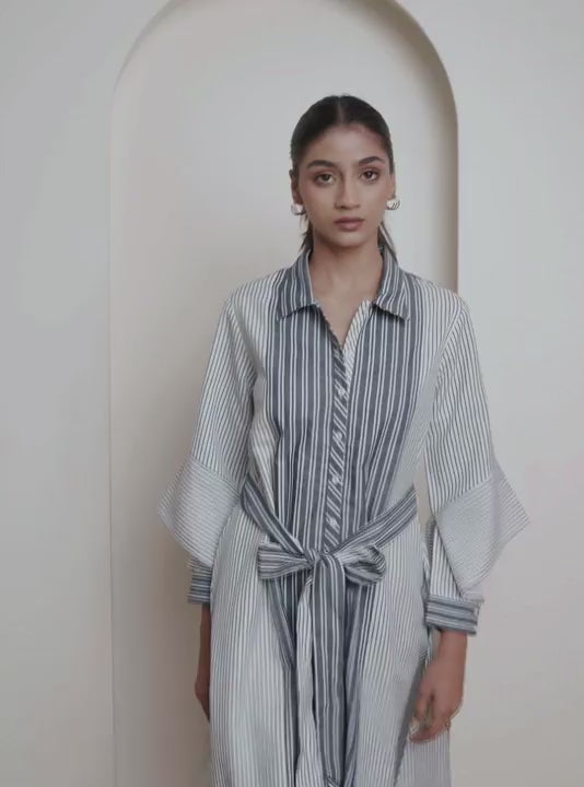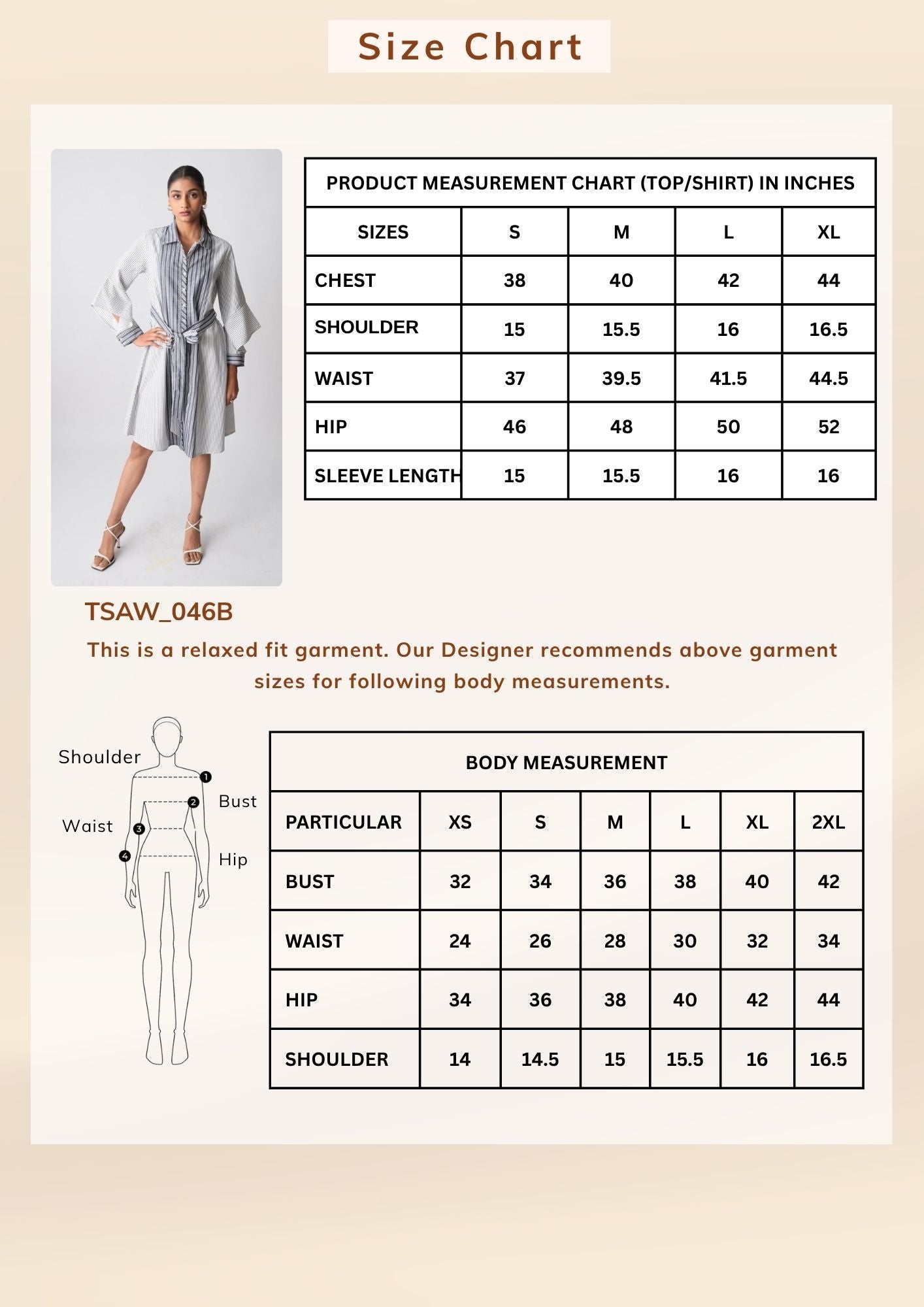 Elevate your workwear and casual wardrobe with Blue & White Striped Shirt Dress. Featuring a collared neckline, button-down front, and a waist-defining self-tie belt, this cotton dress balances structure and comfort perfectly. The flared hem and statement sleeves add a chic touch for day-to-evening elegance