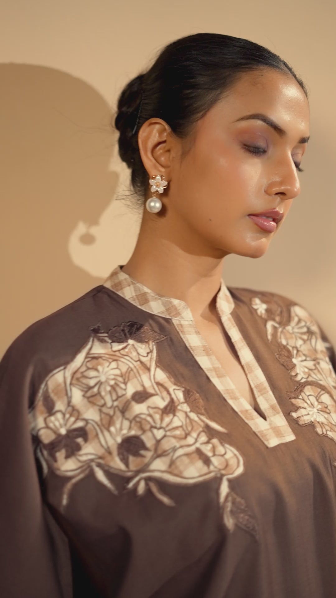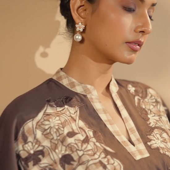 Cocoa Bloom Kurta Set combines comfort and sophistication. In rich chocolate brown, the relaxed-fit ensemble features delicate beige embroidery on the yoke and sleeves, accented with a checked trim for a stylish finish. Perfect for brunches, travel, or relaxed evenings, it’s the ideal fusion of ease and elegance.