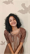 Cocoa Brown Embroidered Dress is a sophisticated blend of earthy tones and handcrafted finesse. Designed in breathable cotton, it features intricate beige embroidery and structured panel detailing for a flattering silhouette. With elbow sleeves and a soft A-line cut, this dress embodies timeless elegance with everyday comfort