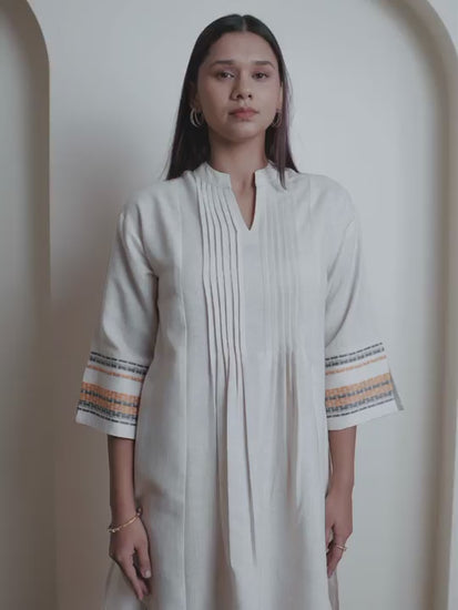 Crafted in breathable Cotton Linen, Mustard Stride Kurta Set blends natural charm with contemporary appeal. The cream pintuck kurta with contrast striped sleeves pairs effortlessly with wide-leg striped pants in mustard and charcoal tones. Designed for versatility and comfort, it’s your go-to outfit for relaxed days or refined occasions