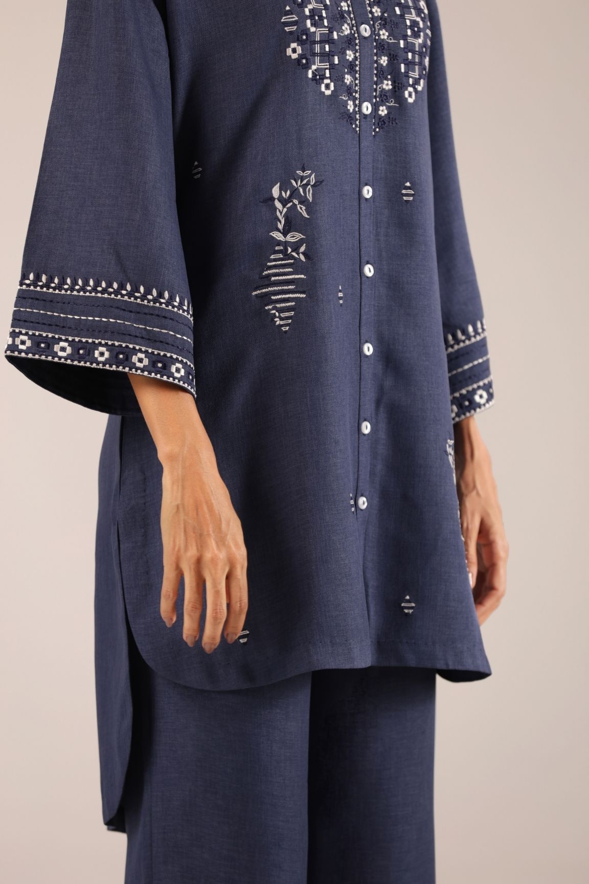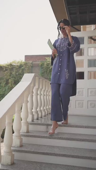 Azure Bloom Kurta Set blends tradition and modernity with ease. Crafted in a rich denim blue tone, this embroidered front-button kurta features intricate threadwork and flared sleeves. Paired with wide-leg palazzos, it offers timeless comfort and style—ideal for festive brunches, ethnic gatherings, or smart casual days out