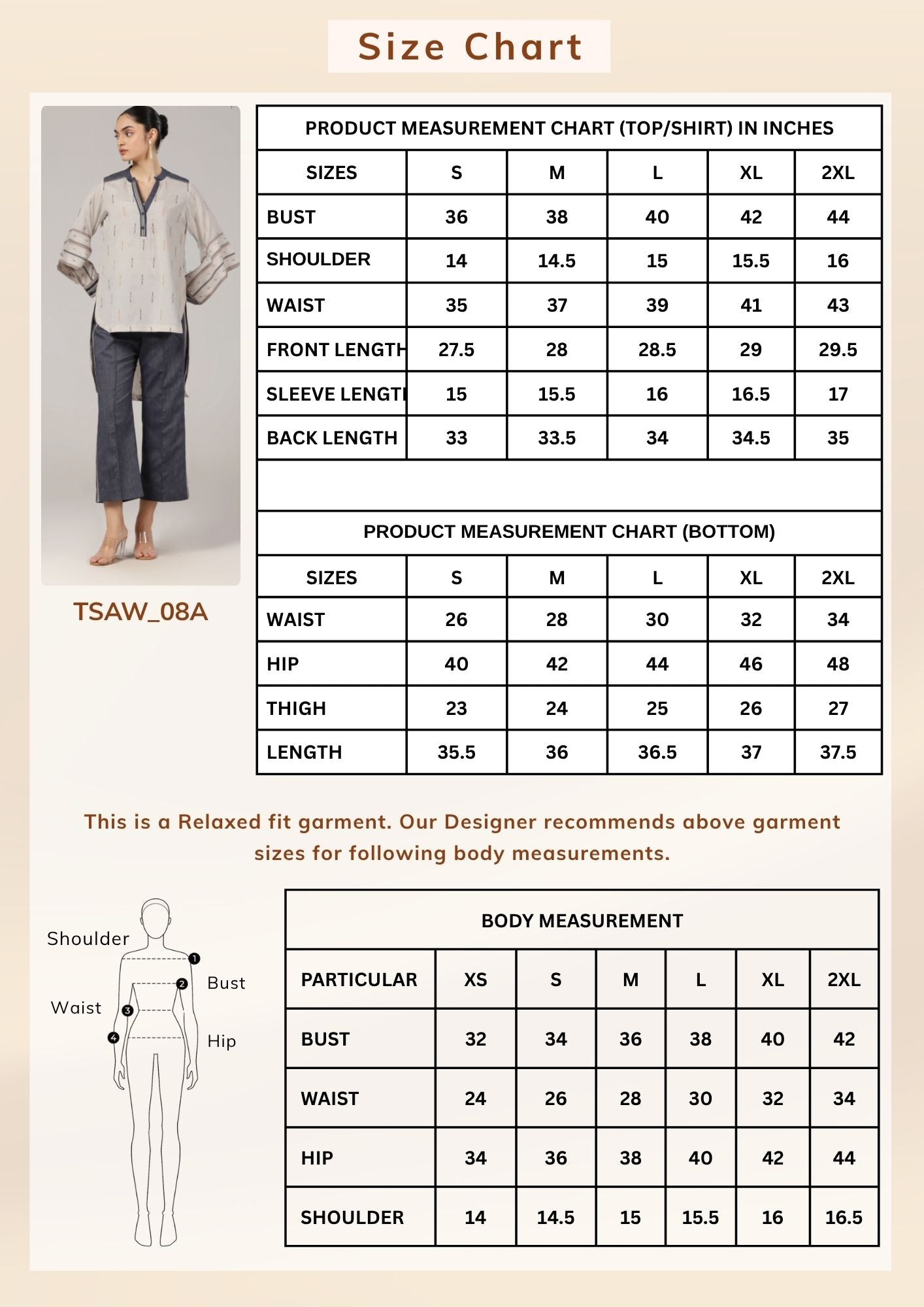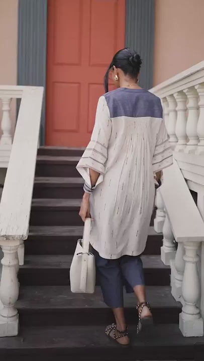 Grey-Blue Ikkat shirt offers a sophisticated twist on everyday wear. The breezy printed Coord with contrast navy panels and layered sleeves is paired with solid blue straight pants for a perfect balance of structure and fluidity. Ideal for elegant daywear, travel, or understated festive gatherings