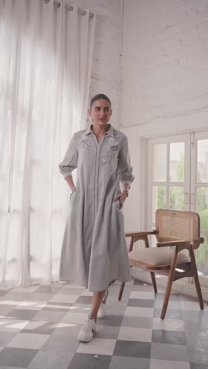 Grey Embroidered Cotton Midi Dress