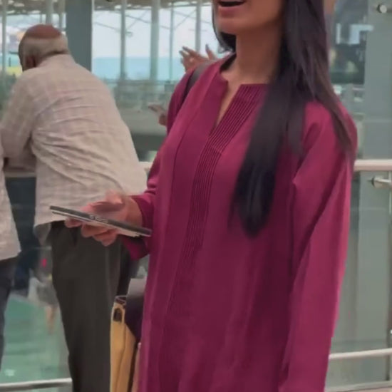 Magenta Pintuck Kurta Set redefines simplicity with elegance. Crafted from a soft, breathable fabric, the kurta features refined pintuck detailing on the front, paired with comfortable pleated pants. The vivid magenta hue adds vibrance, making it perfect for casual gatherings, travel wear, or daily ethnic dressing with a modern touch.