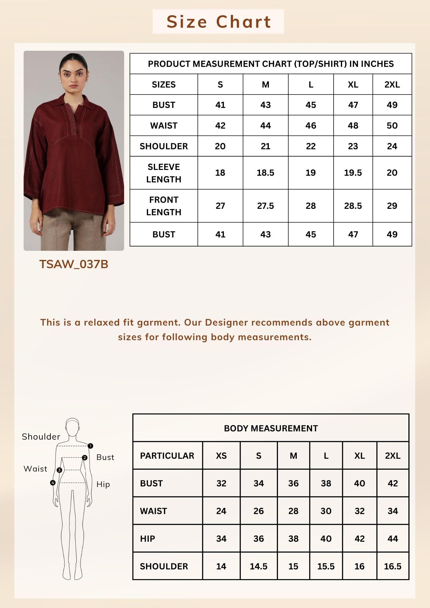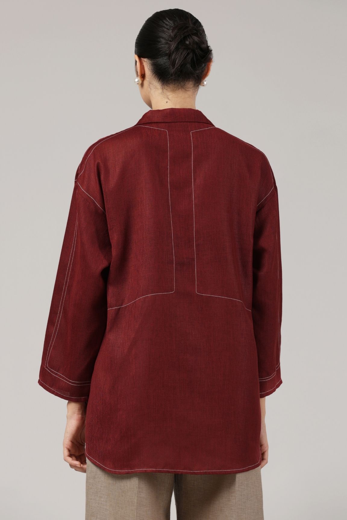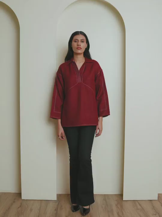 Chic and minimal, Wine Stitch Detail Top is designed for effortless sophistication. Crafted in a deep maroon hue with contrast white stitching, this relaxed-fit top features a notch neckline and long sleeves. Made from breathable cotton fabric, it’s a timeless wardrobe essential for refined everyday and travel wear