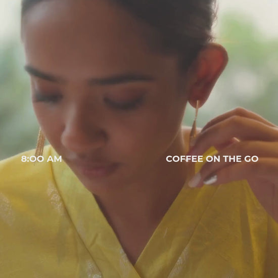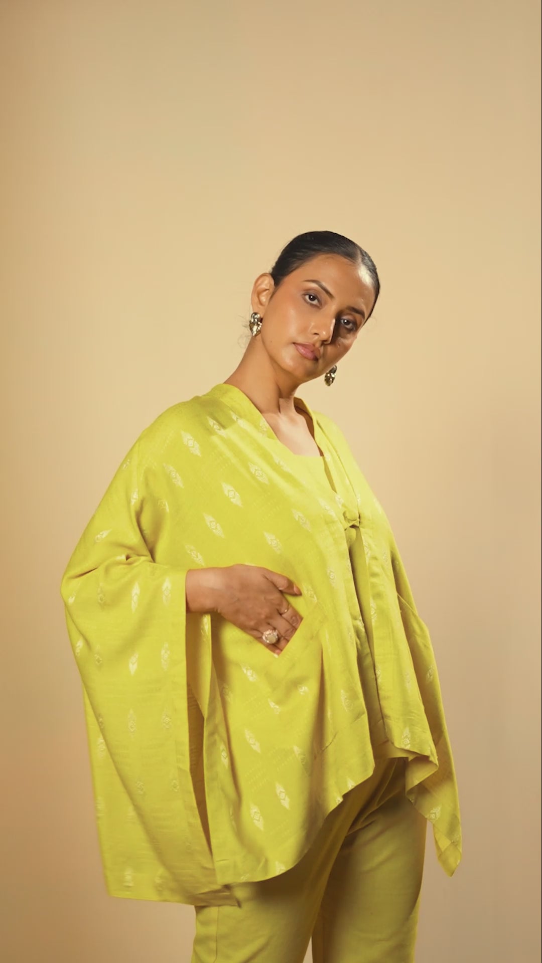 Golden Weave Blazer Set is a celebration of modern Indian artistry. Crafted from premium handwoven cotton, this mustard yellow set includes straight-fit trousers, a minimal inner top, and a flowy cape-style overlay with delicate woven motifs. Lightweight and elegant, it’s perfect for festive brunches or relaxed cultural gatherings.
