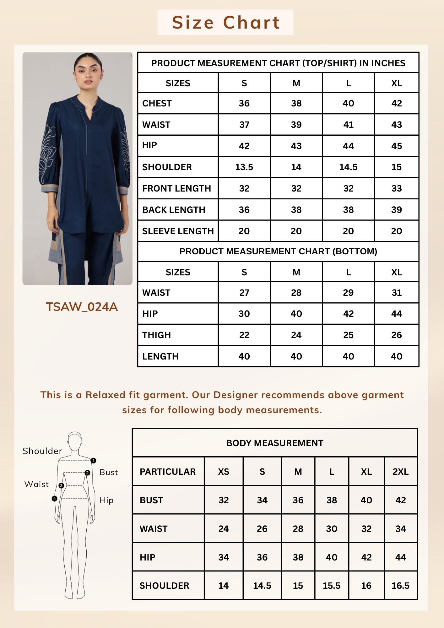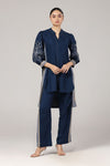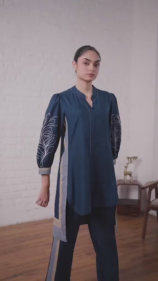 This Navy Blue Embroidered Kurta Set redefines minimal elegance with a modern edge. Crafted from premium organic cotton, the set features a straight kurta with tonal embroidery on sleeves and side contrast panels, paired with tailored straight pants. A perfect blend of style and sophistication for workwear or evening outings