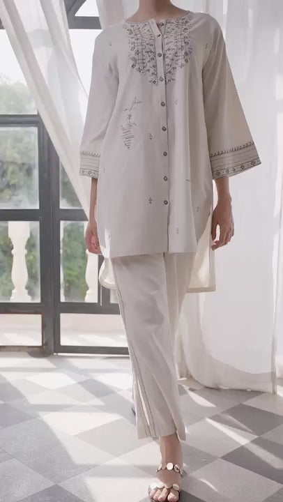 Off-White Embroidered High-Low Kurta Pant Set combines timeless grace with modern structure. Crafted from a premium cotton blend, the set features intricate thread embroidery, a flattering high-low hemline, and wide-leg pants. Designed for effortless sophistication, this ensemble transitions seamlessly from casual daytime elegance to refined festive wear.