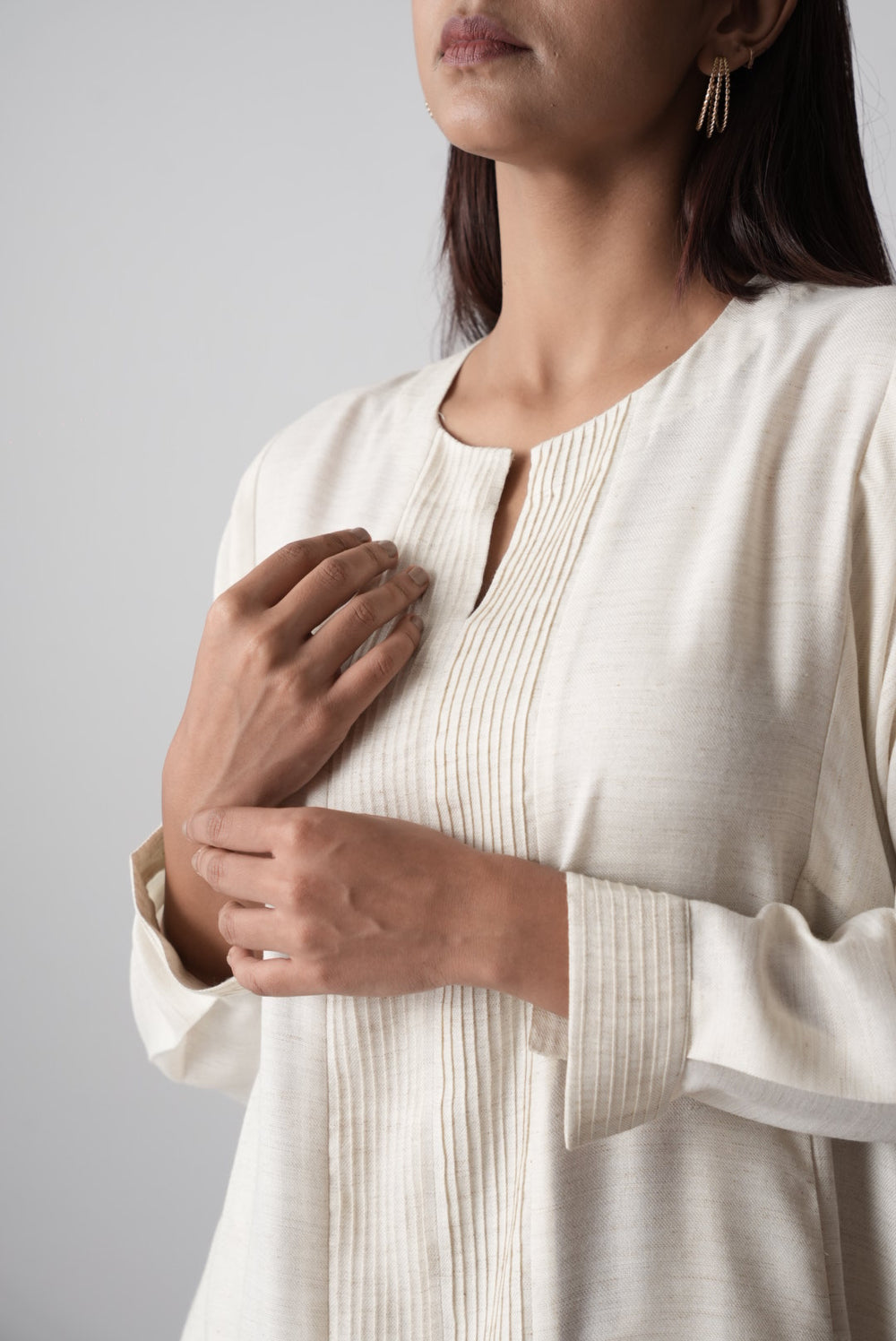 Presents a timeless Off-White Pintuck Kurta Set designed for understated elegance. Crafted from a premium cotton-linen blend, the kurta features fine pintuck detailing along the front and cuffs. Paired with comfortable pleated pants, this set is ideal for work, travel, or refined casual wear — exuding effortless sophistication in every stitch.