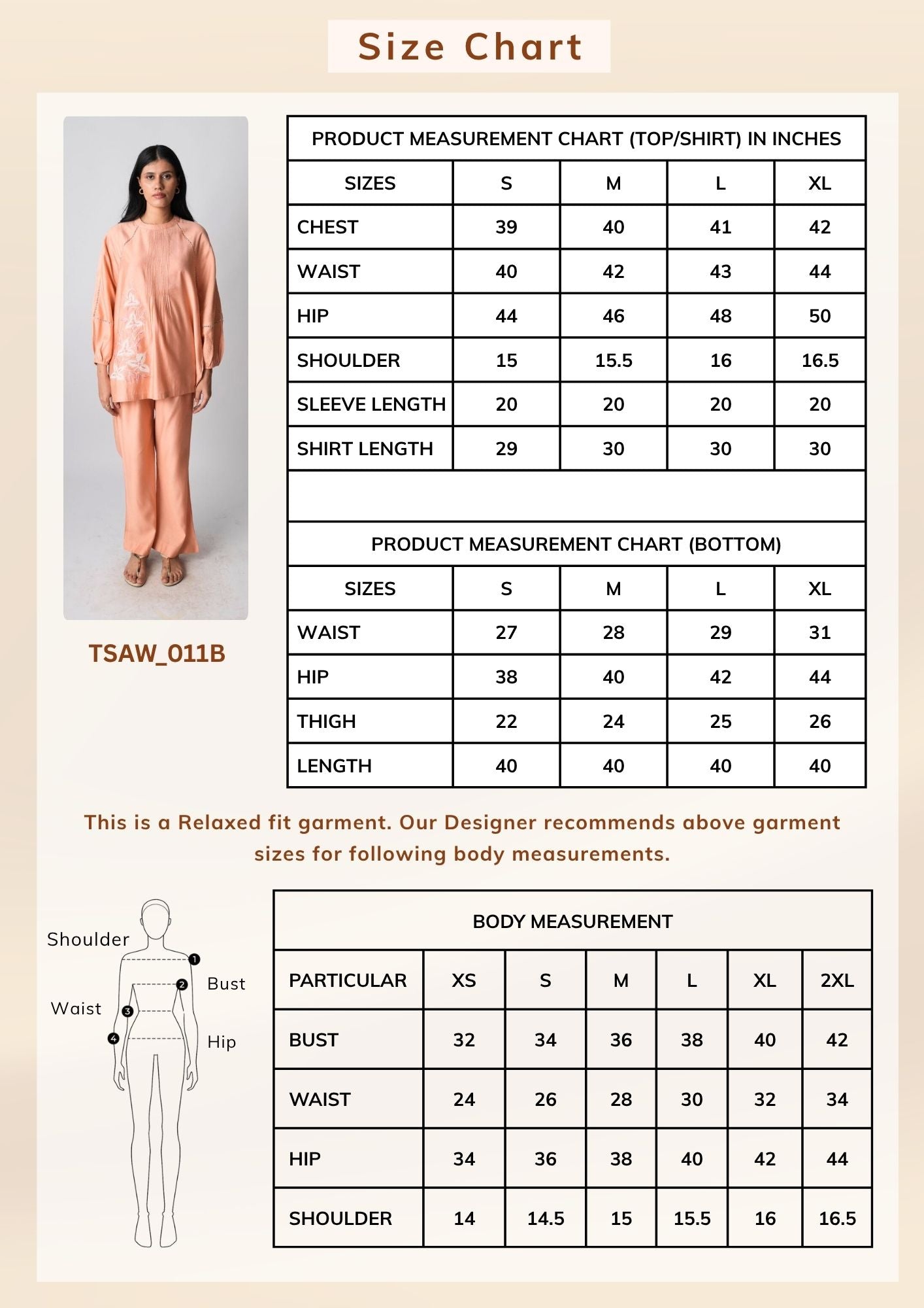 Effortless elegance meets modern sophistication in Blush Radiance shirt. Crafted in a lustrous peach Cotton Satin, this ensemble features a delicately embroidered top with pintuck detailing and straight-fit matching trousers. Perfect for daytime events, dinners, or festive gatherings, it balances comfort, polish, and timeless grace effortlessly
