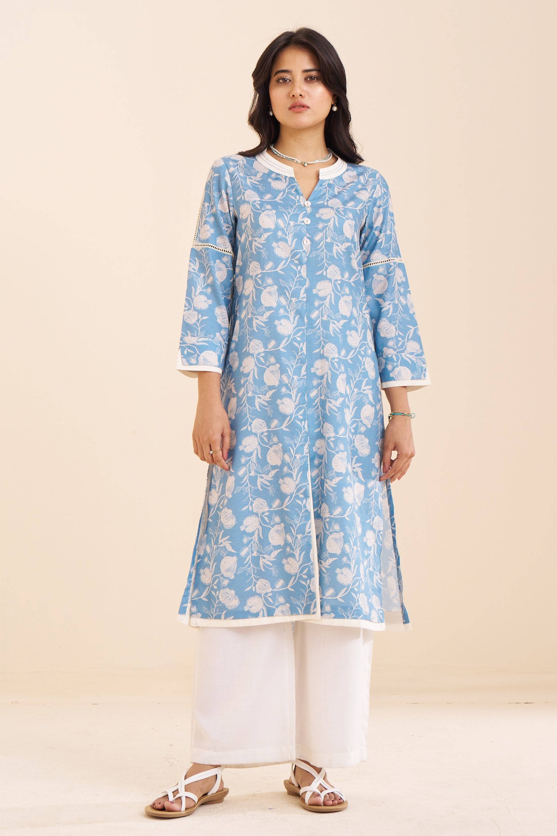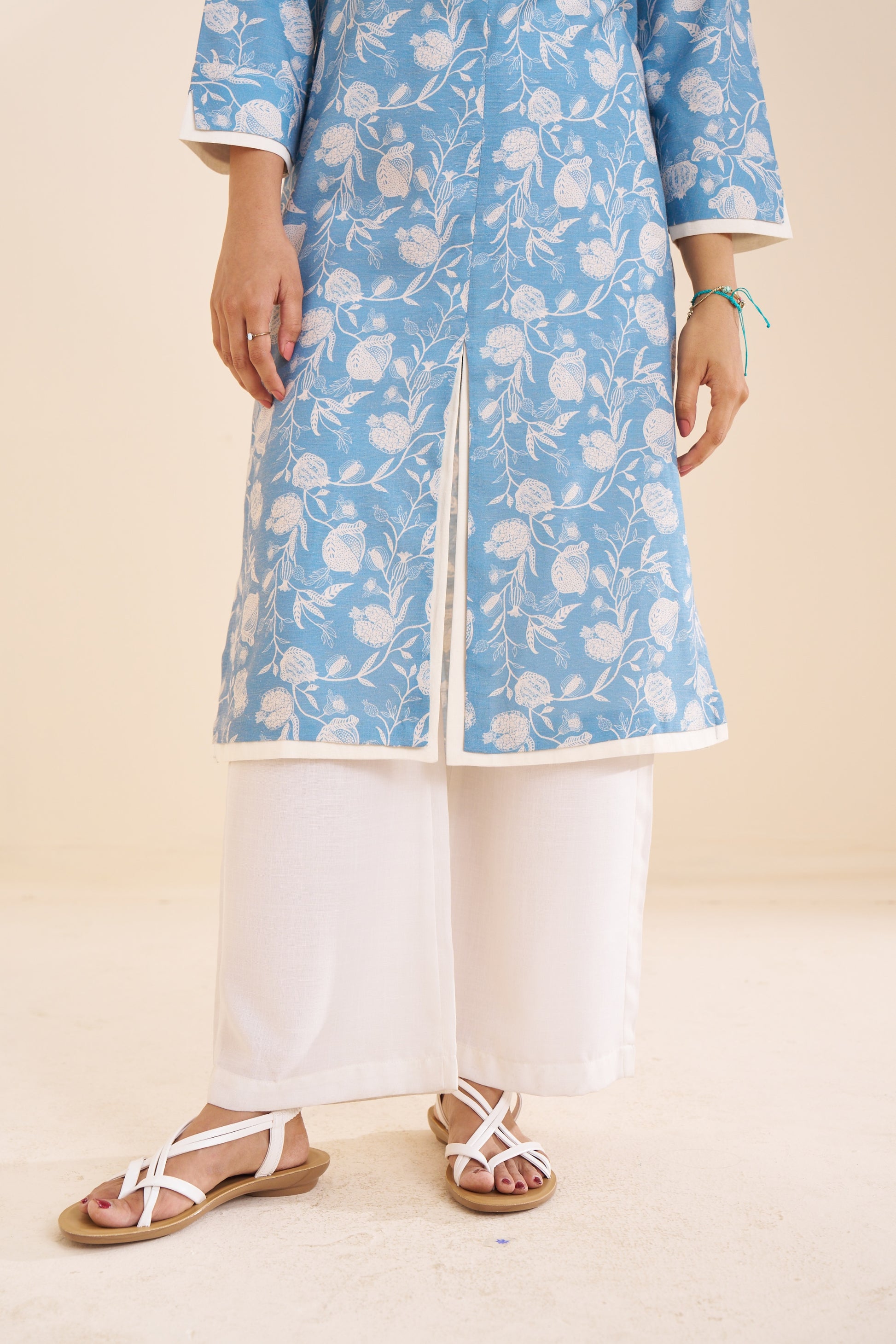 The soothing blue hue paired with delicate prints creates a refreshing and contemporary look, ideal for everyday wear. Crafted from a breathable linen blend fabric, it keeps you cool and comfortable throughout the day. Style it with off-white or neutral bottoms and minimal accessories for a relaxed daytime vibe.