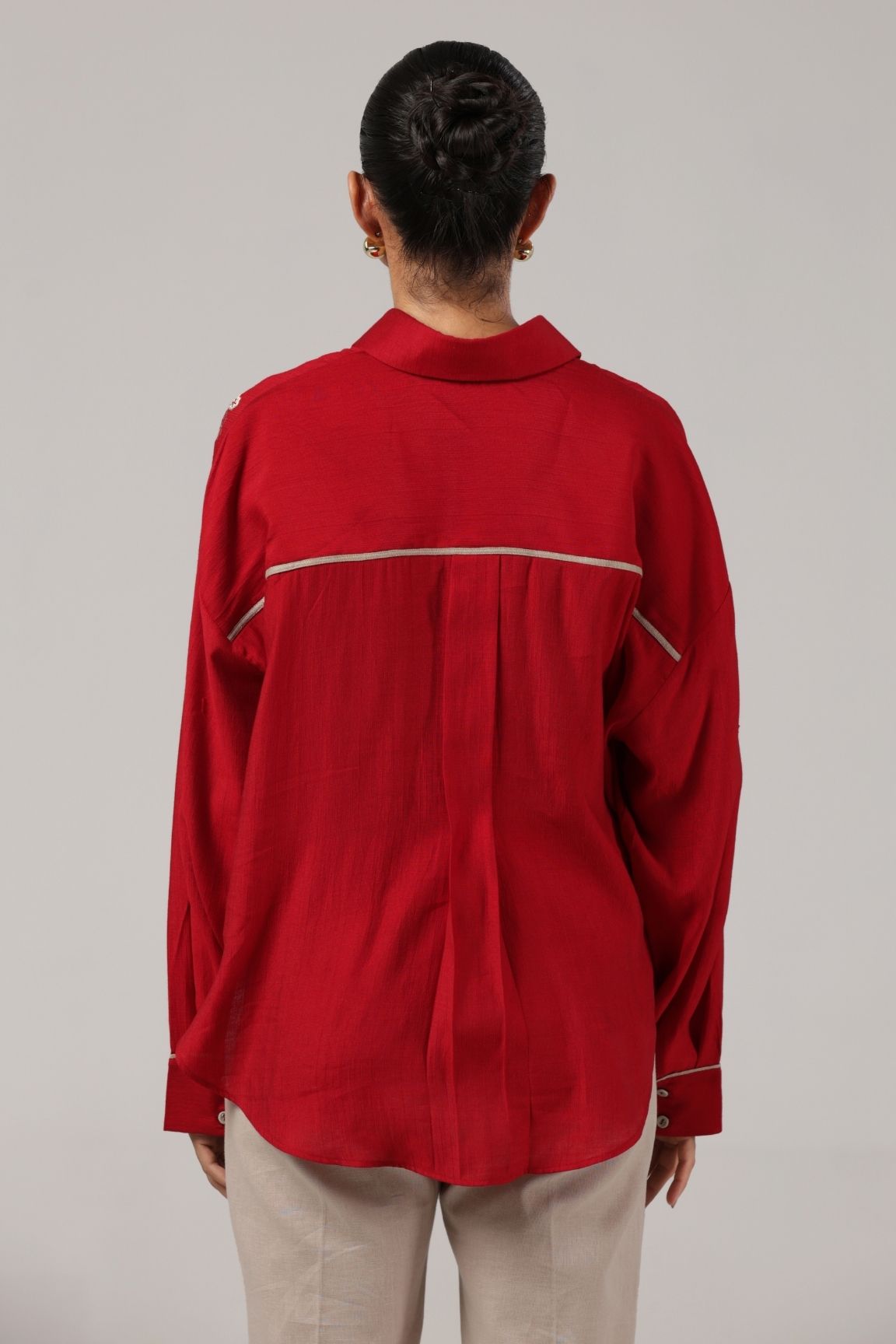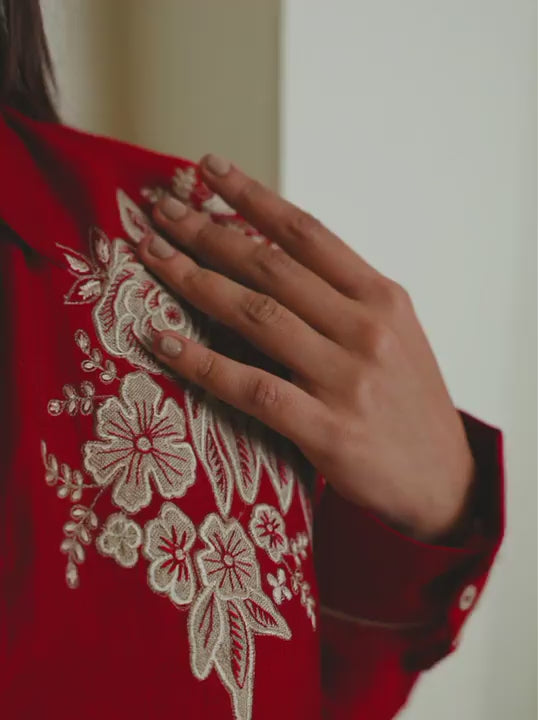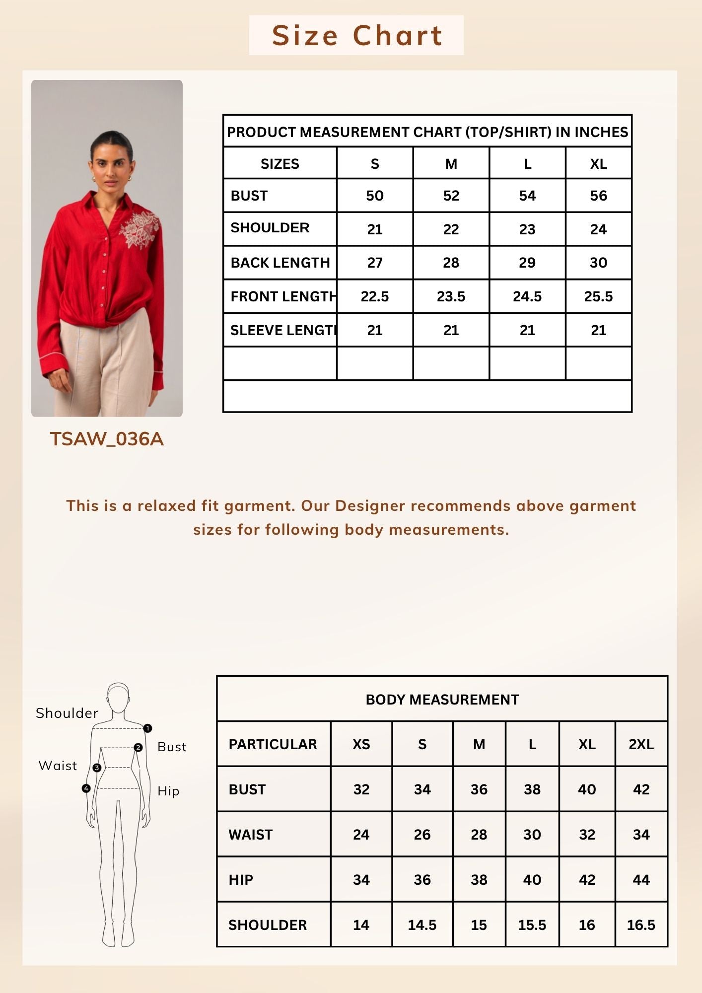 Add a hint of elegance to your wardrobe with Scarlet Bloom Shirt. Crafted in a rich red hue, it features delicate beige floral embroidery on the shoulder and a button-down front. Designed in breathable fabric with a relaxed silhouette, this piece transitions effortlessly from workwear to weekend outings.