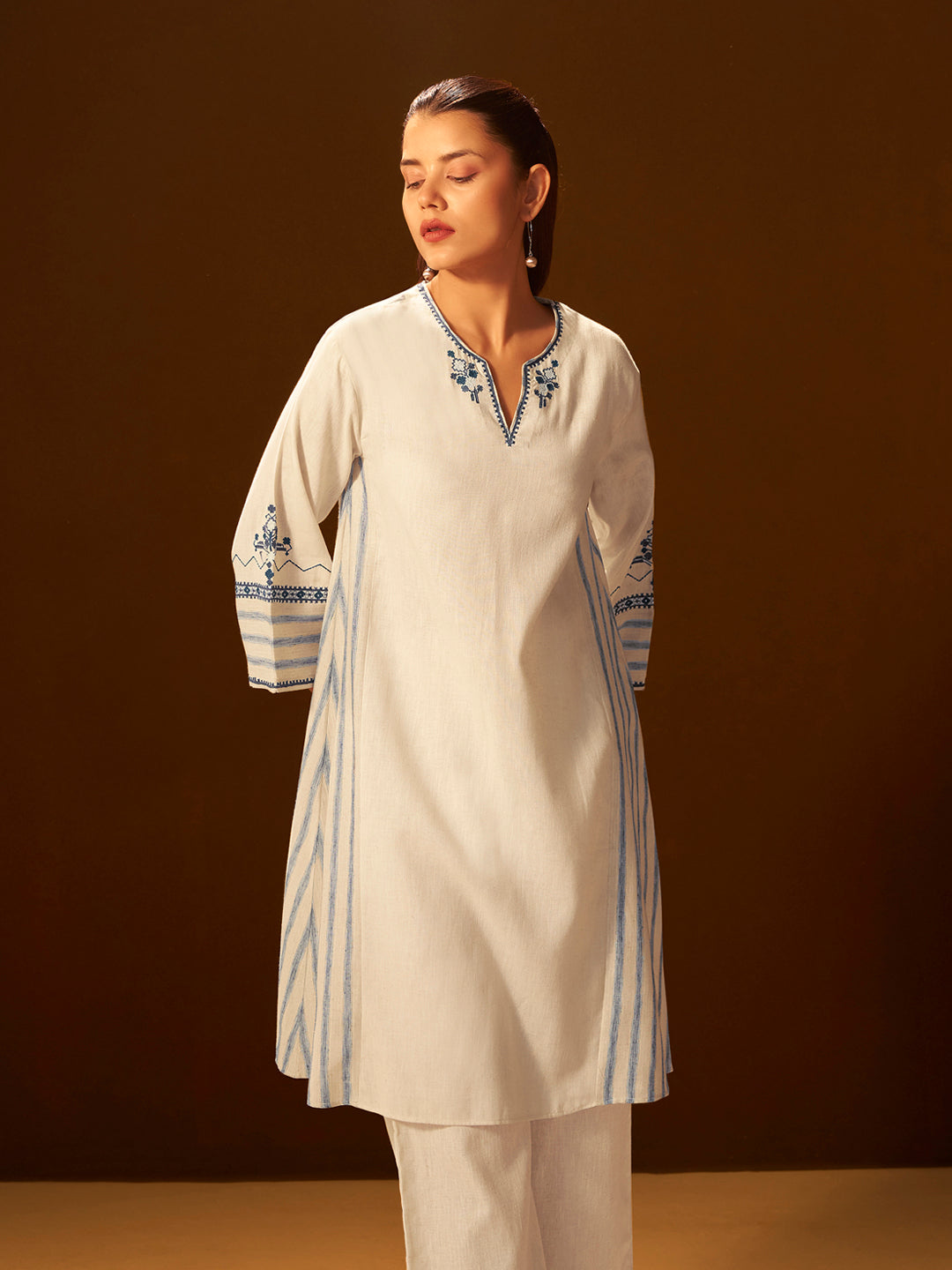 Experience effortless elegance with White and Blue Embroidered Kurta. Designed in soft, breathable cotton, this set features a delicately embroidered neckline and sleeves with striped detailing for a modern ethnic twist. Perfect for brunches, office wear, or travel, this set ensures comfort while keeping your look chic and refined