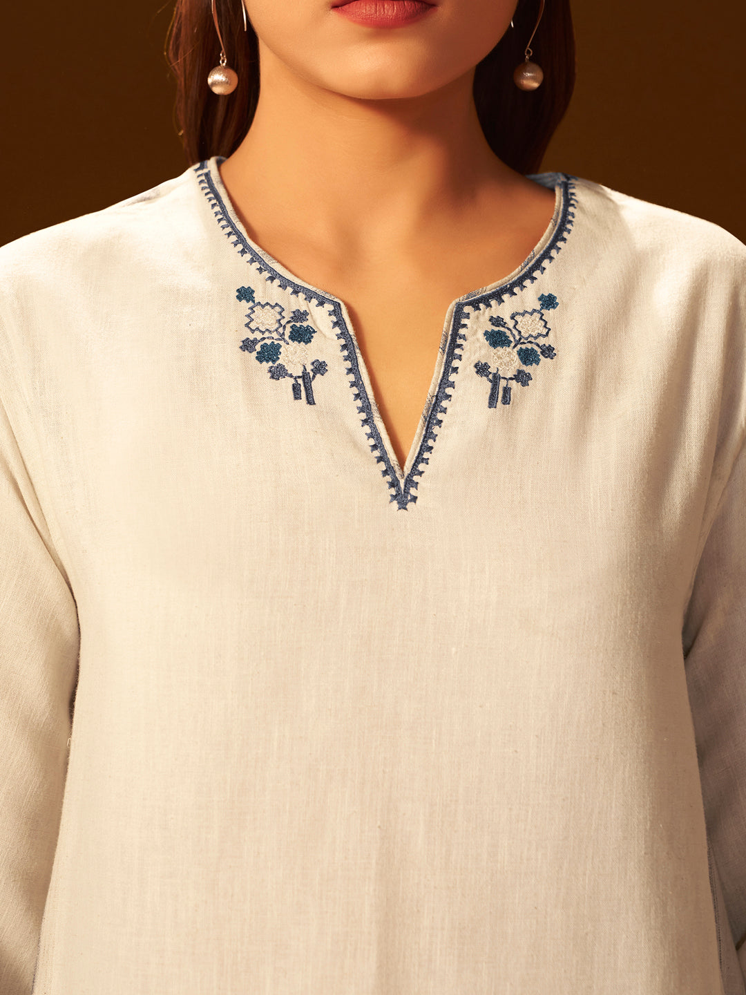Kurta: V-neck with embroidery, 3/4th sleeves, side slits