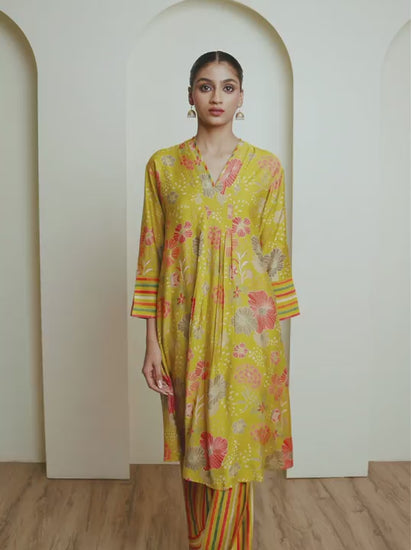 Brighten your look with Yellow Floral Printed Kurta Set. Made from breathable cotton, this two-piece outfit features a floral printed A-line kurta with pleated detailing and striped hem sleeves, paired with matching multicolour striped pants. Perfect for summer days, casual outings, and ethnic-inspired everyday wear with a touch of cheer
